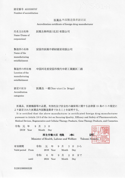 公司獲得日本厚生勞動省“醫(yī)藥品外國制藥業(yè)者認(rèn)定證”